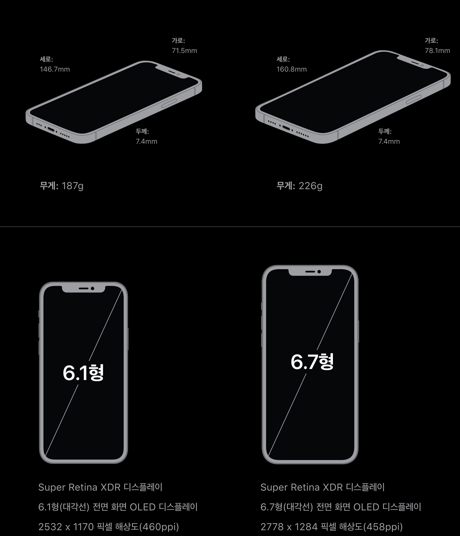 아이폰 12 프로 맥스 : 가로 78.1mm / 세로 160.8mm / 두께 7.4mm / 무게 226g / 6.7인치 디스플레이