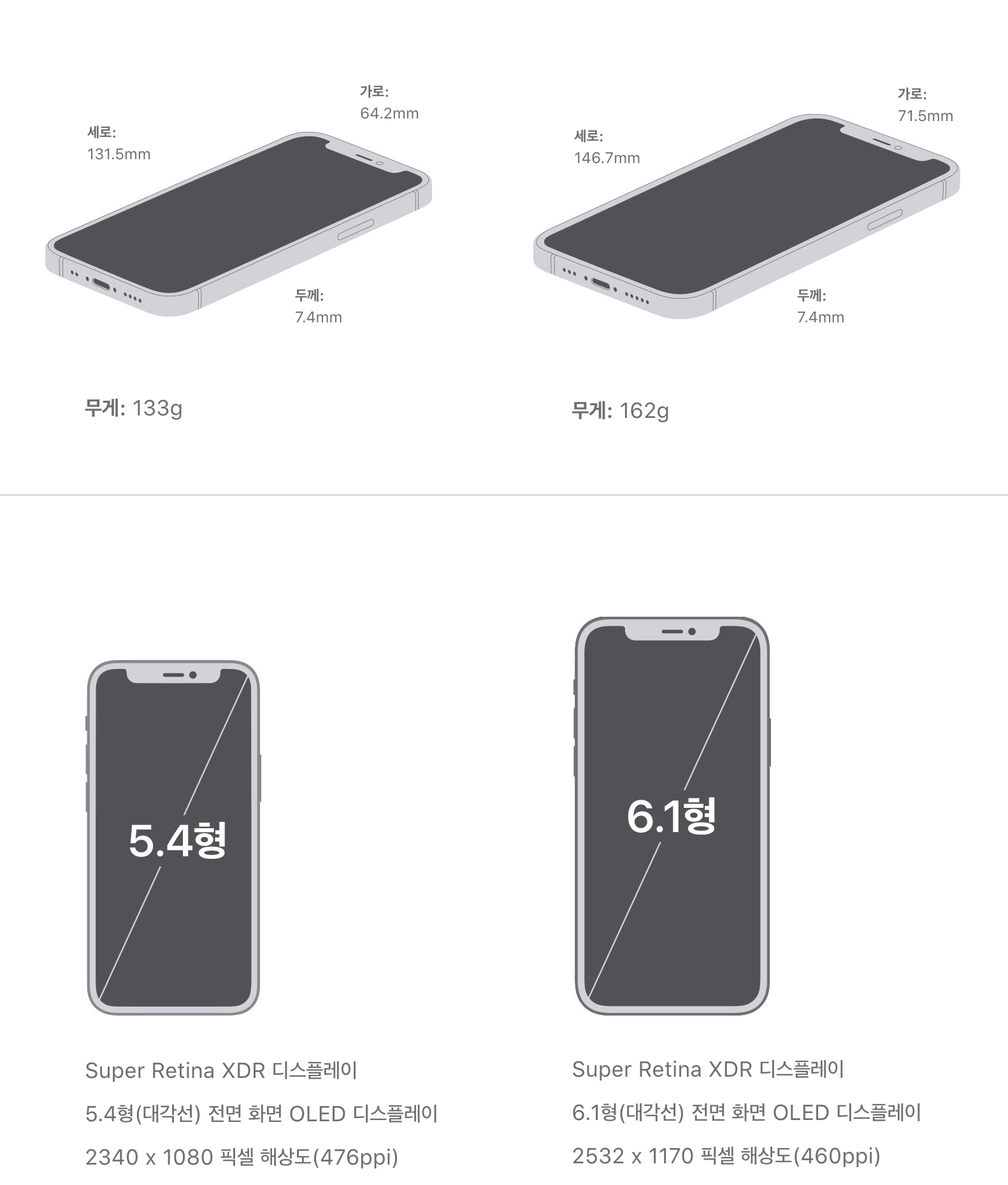 아이폰 12 미니 : 가로 64.2mm / 세로 131.5mm / 두께 7.4mm / 무게 133g / 5.4인치 디스플레이